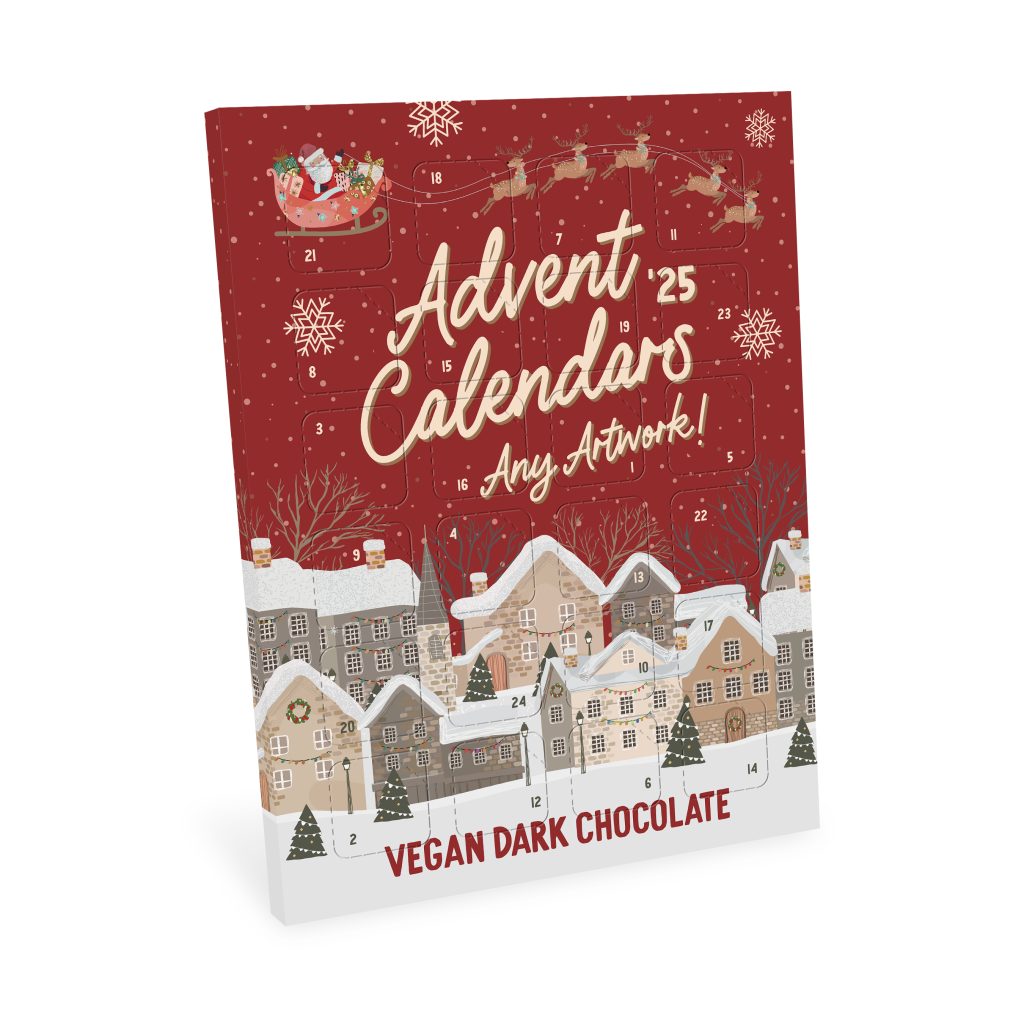 Delicious advent calendars filled with dark vegan chocolates (made in-house using the finest cocoa at our UK chocolate factory).
