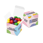 Our Eco Mini Cube Box comes filled with Skittles, scooped directly into the box.