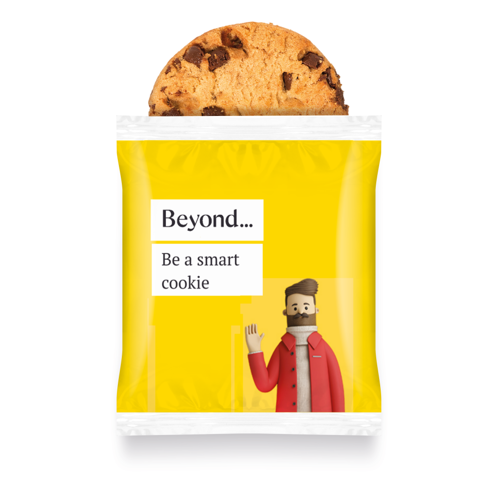 One flow wrapped Maryland chocolate chip cookie. Branded with a full colour digital print to our plastic film.