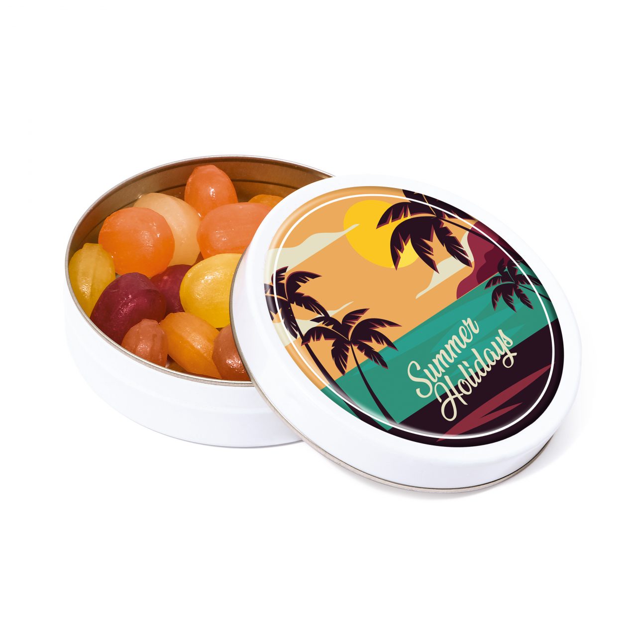 A small circle sweet tin, filled with hard boiled fruit candy.