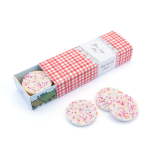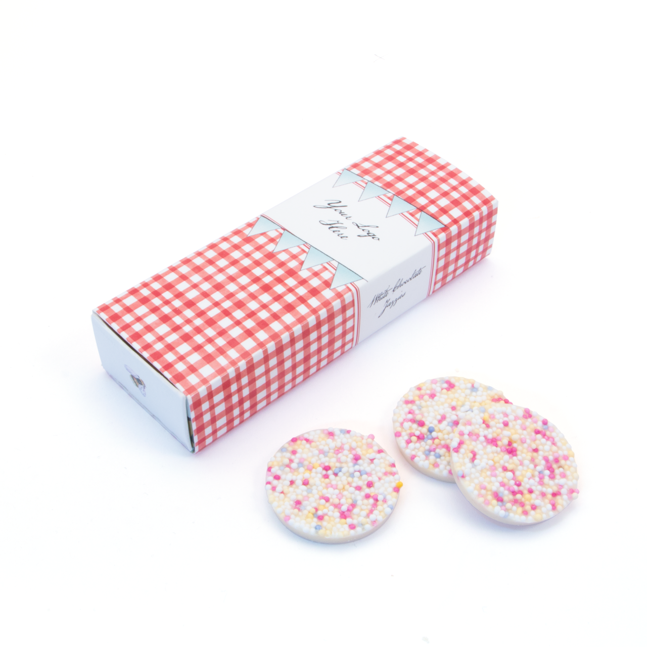 White chocolate flavour buttons decorated in crunchy summer sprinkles – what’s not to love? You’ll find nine of these much-loved retro Jazzies in our environmentally friendly Century Box (which slides out like a handy matchbox to reveal the English countryside). They’re perfect for events or little thank you gifts.