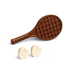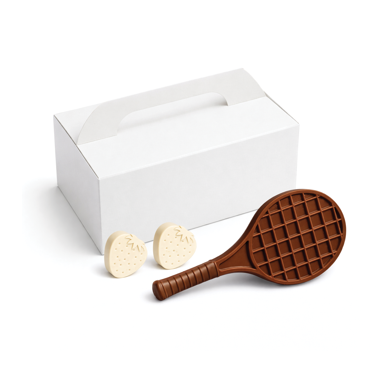 Includes one bespoke-moulded tennis racket and two strawberry shaped chocolates.